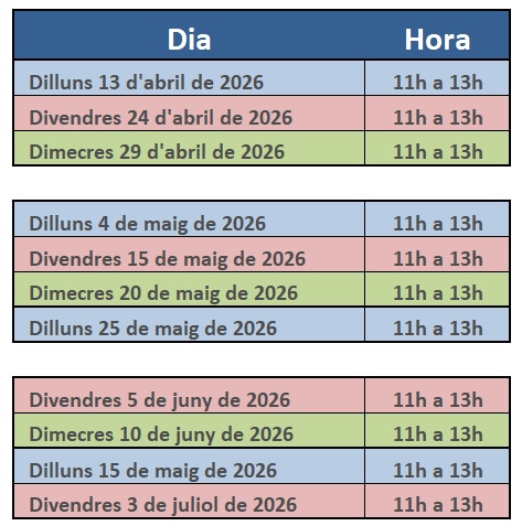 Aquest és el calendari d’obertura de la seu de la URCAT per als mesos d’abril, maig i juny de 2026. L’adreça és Carrer Mercat, 2, 1er – 107 de La Llagosta. Clic en el Mapa enllaç. Tots els socis i simpatitzants estan convidats a apropar-s’hi per requerir informació, simplement saludar o operar l’estació EA3URC, que permet treballar en bandes HF, VHF i UHF.